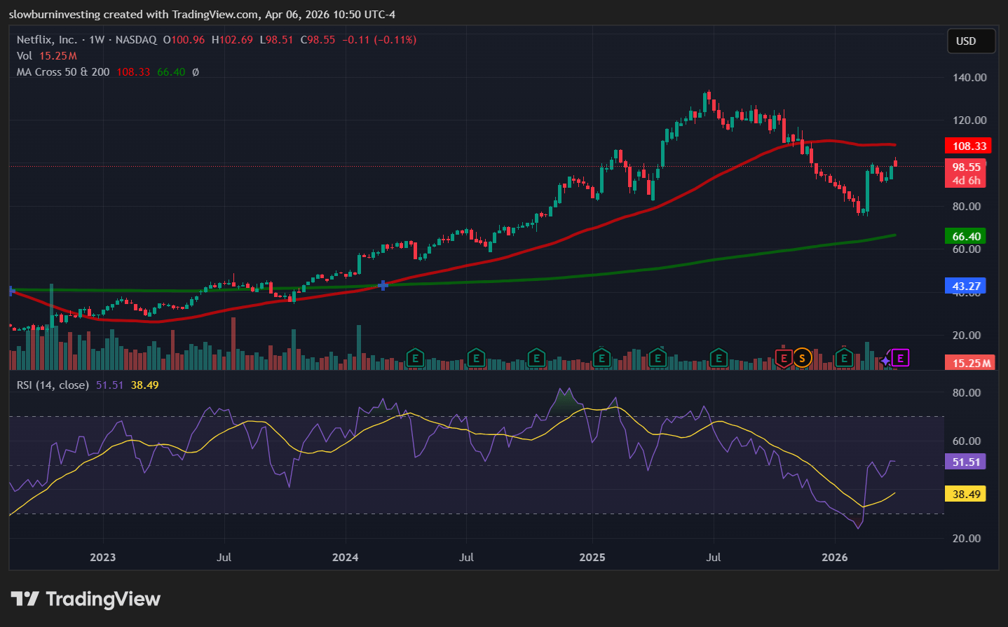 The stock dropped about 27% from its high, partly because Netflix stopped reporting quarterly subscriber numbers (making it harder for Wall Street to model) and partly because the trailing P/E of ~39x looks expensive. But on a forward basis (~31x) with 25% EPS growth, the valuation is actually quite reasonable for the quality of business Netflix has become.